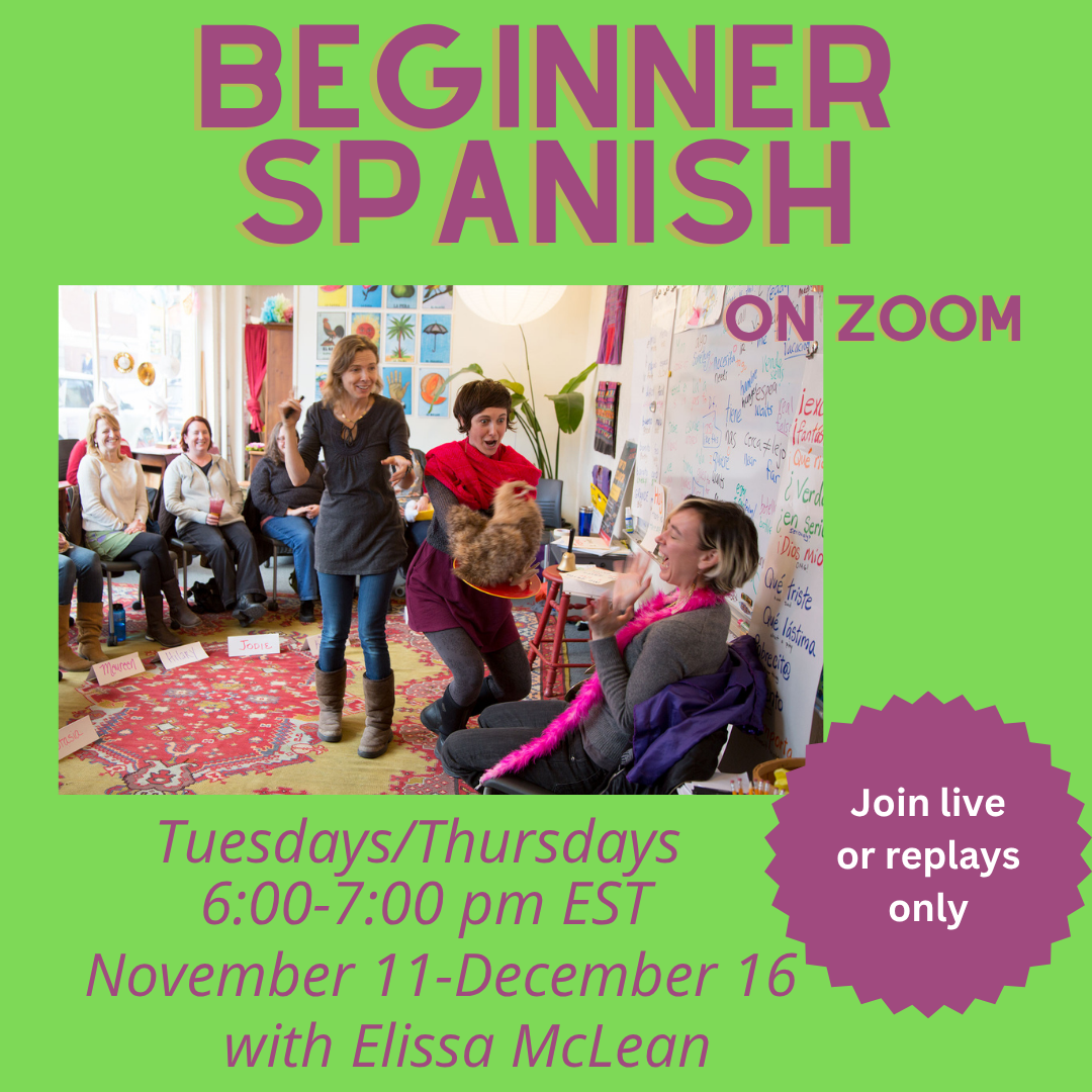 The term “beginner” is in quotes because many people who have studied Spanish in a conventional setting for years enroll and benefit from the class. As long as you still struggle in basic conversation, this is a good class for you. We recommend taking the Beginner class a few times. (See video below.)